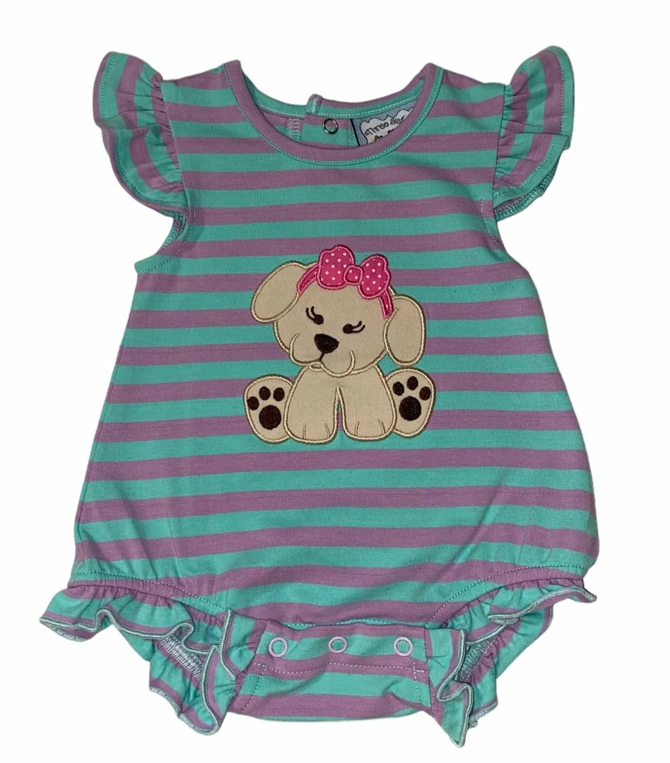 Three sisters flutter sleeve stripe puppy applique bubble. This line doesn’t run large and fits more true to the smaller side. So if the fit is in question size up.
