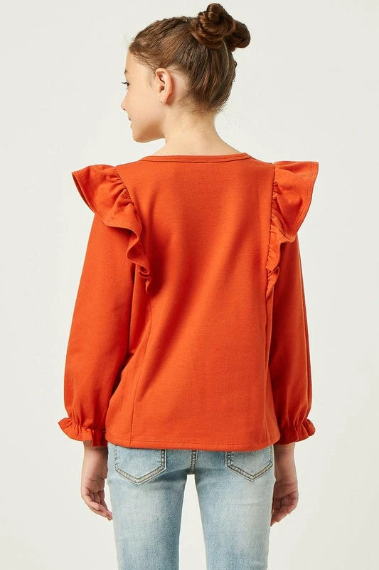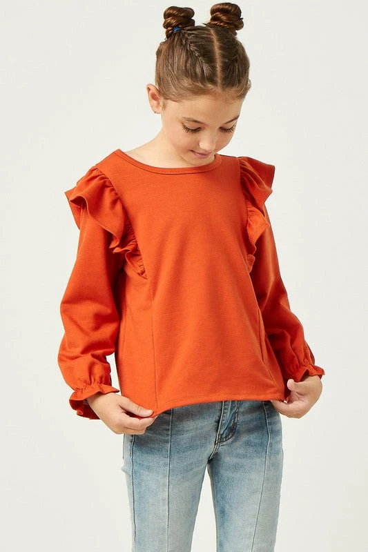 Girls Soft French Terry Cuffed Ruffled Top *French Terry Knit Fabric *Round Cut Neckline *Ruffle Details