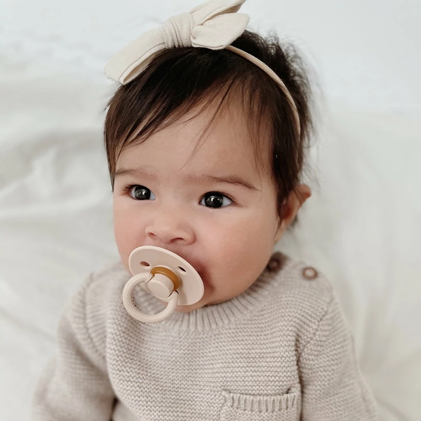 Natural Rubber Pacifiers! Each natural rubber nipple is cherry-shaped to mimic breastfeeding & accented with a cable handle. Doubly-soothing, every packaged set includes two complementary colors while meeting ASTM safety standards and are BPA-free. Tranquility (and chill vibes!) are restored for your little cutie! Pack of 2 pacifiers. Ages 0m-6m.