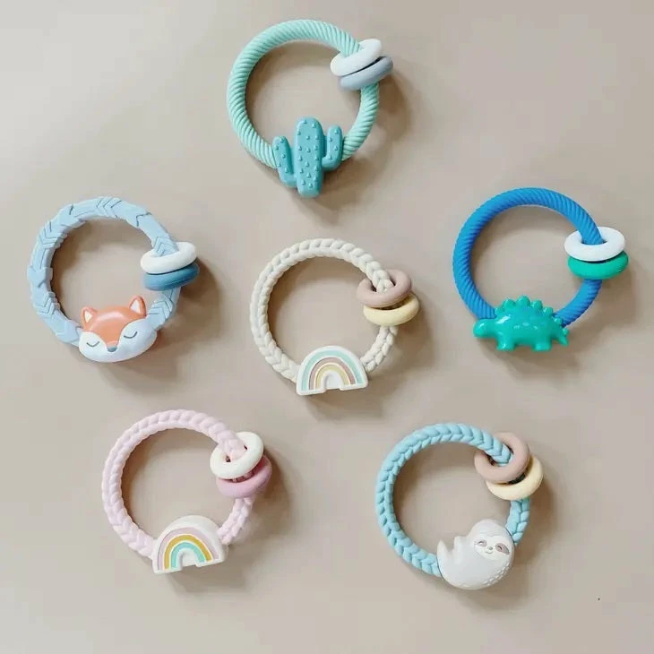 Shake the teething blues away with an adorable Ritzy Rattleβ’! Our silicone rattle teether features a gentle rattle sound and includes two silicone rings to keep babyβs hands busy. The rattle teether is easy for baby to grasp and its raised textures will help soothe and massage sore gums. The Ritzy Rattleβ’ is designed for ages 3 months and up and coordinates beautifully with our Sweetie Soothersβ’ silicone pacifiers.