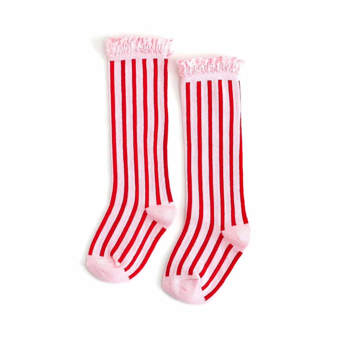 Candy StripeΒ Lace Top Knee Highs for babies, toddlers and girls! Candy Stripe is back and better than ever! We added the sweetest pink lace to the tops of these customer favorites! These candy cane inspired socks are extra soft and cozy and will be her favorite socks all season long! New colors for 2022! The red stripes in the knee highs this year are bright red instead of true red. Colors will not match the Candy Stripe knee highs from 2021 Christmas Collection. Β Machine wash cold with like colors. Β Tumble dry low or lay flat to dry. 76% cotton / 22% polyester / 2% spandex