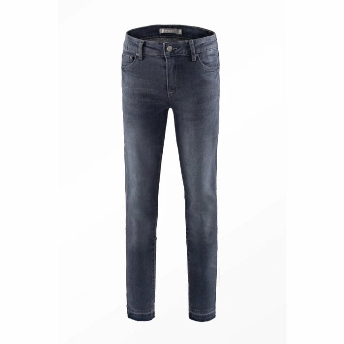 Soft and skinny with stretch in a mid-rise fit, featuring an indigo-grey wash, fading, and subtle raw hem detailing. Grey.